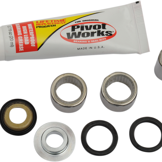 Caracteristicas: Kit contains two PTFE spherical bearings (cup bearings when used), four seals and related components Each shock kit rebuilds both ends of the shock absorber Some shock absorbers on Kawasaki and Honda models use a clevis to connect shock to the linkage. The bearing, collar and seals that are pressed into the linkage arm are included in the Pivot Works Shock Kit.