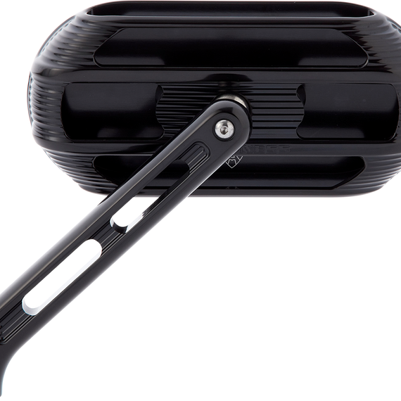 Caracteristicas: Oval shaped mirror inspired from the angled Sidekick Air Cleaner Mirror measures 5.45" wide x 2.5" high Mirror head and stem forged from billet aluminum CNC machined detail seen from all angles Heavy duty stainless steel internal pivot hardware Standard and metric mounting hardware included Laser engraved Arlen Ness logo