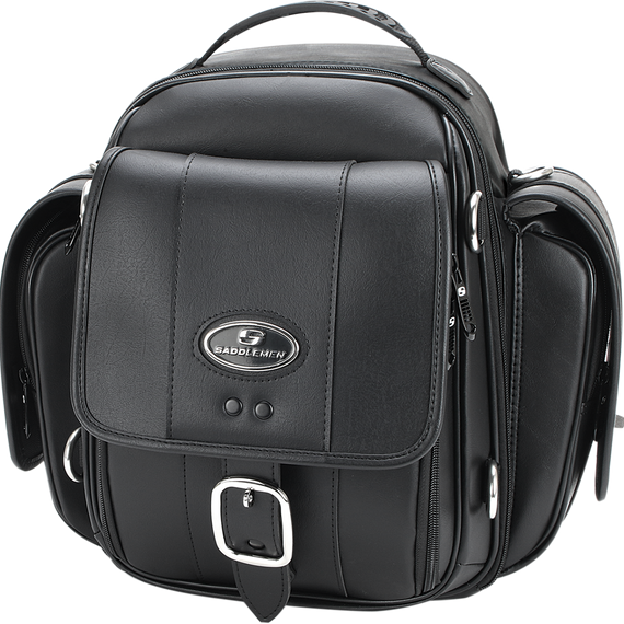 Caracteristicas: Whether it is a day ride or a weekender, Saddlemen's sissy bar bags go the distance Built to last with over-sized hardware, riveted straps/handle and lots of space to pack it full for your journey Main cargo compartment flap opens fully with solid tethered sides for easy loading Adjustable shelf allows you to organize your bag for easy access Works with or without a rack with the newly designed adjustable mounting sleeve that adapts to the shape and width of your bike's sissy bar Heavy-duty leather tech construction EVA molded organizer that stores phone and other valuables safely Multiple over-sized mounting rings around the bag overcome unique mounting challenges Honeycomb rigid luggage shell maintains its shape regardless of cargo load, yet it is lightweight to reduce the impact on your motorcycle Strong nylon meshing zipper teeth with chrome sliders equipped with large pulls for easy use with a gloved hand High-visibility reflective rain cover with locking cinch cord included Measures 11" W X 11" H x 14½" D Dimensions are for the main body; side and front pockets add an extra 2.5" to each side.