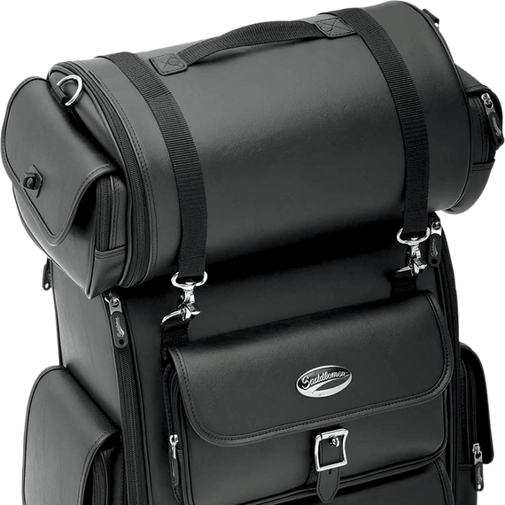 Caracteristicas: Two full side openings allow easy access to bag contents while bag is still mounted on bike Fully adjustable sissy bar mounting system goes on in seconds over any size and style sissy bar pad; once adjusted for your size pad, you never need to adjust it again Rigid construction provides rider support and can be leaned back on when mounted on backseat Multiple exterior pockets Internal adjustable shelf Raincover included Constructed of UV-resistant leather-grain composite Roll bag included for extra cargo capacity Dimensions: 15" W x 18" H x 8"D. Roll bag measures 14" W x 8½" H x 8½" D