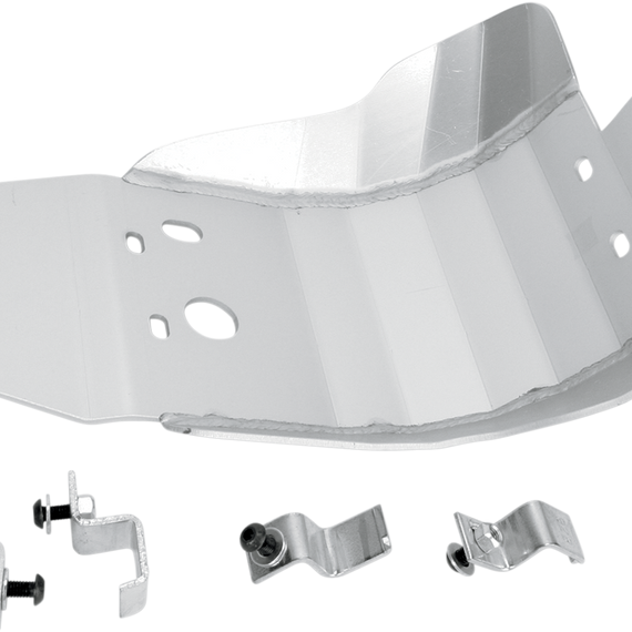 Caracteristicas: Protect vital engine parts and cases from rocks and debris Clear anodized for corrosion protection and good looks Skid plates made from 3/16" 5052 H-32 aluminum Smooth underside won't snag when crossing logs Oil drain hole on all required models Heat-treated chromoly steel clamps keep plates mounted securely All mounting hardware included Made in the U.S.A.