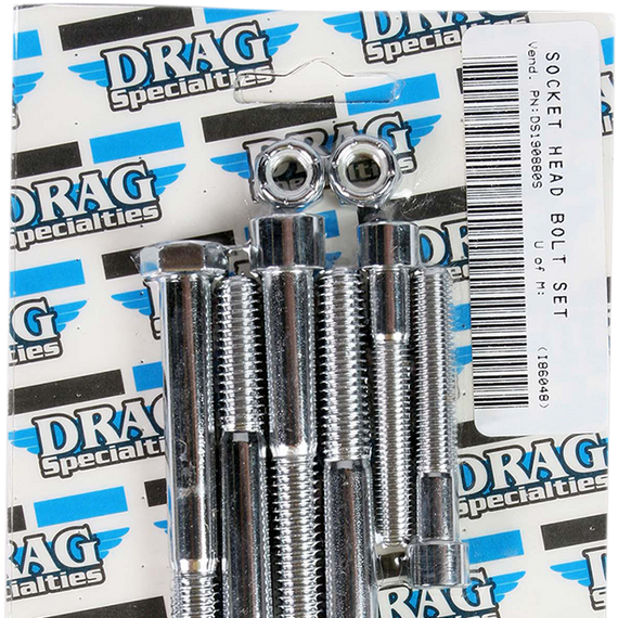 Caracteristicas: Socket-head bolt sets to meet virtually any custom need Complete motor sets for 07 and later Big Twin include bolts for primary, cam, cam sensor, derby, rocker box, transmission top, transmission side, lifter block and clutch covers Complete motor sets for 87-94 Big Twin include bolts for cam, primary, point, clutch, inspection and chain covers, lifter base, inner primary, top front and rear motor mounts, timing plug and header mount screws Complete motor sets for 04 and later XL include bolts for primary, cam, derby, lifter block, points cover, rocker box and engine case Complete motor sets for 86-03 XL include bolts for cam, primary, generator, sprocket, rocker box, top motor mount, lifter base, point or magneto cover Made in the U.S.A.