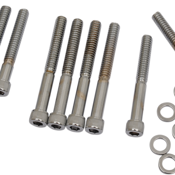 Caracteristicas: Socket-head bolt sets to meet virtually any custom need Complete motor sets for 07 and later Big Twin include bolts for primary, cam, cam sensor, derby, rocker box, transmission top, transmission side, lifter block and clutch covers Complete motor sets for 87-94 Big Twin include bolts for cam, primary, point, clutch, inspection and chain covers, lifter base, inner primary, top front and rear motor mounts, timing plug and header mount screws Complete motor sets for 04 and later XL include bolts for primary, cam, derby, lifter block, points cover, rocker box and engine case Complete motor sets for 86-03 XL include bolts for cam, primary, generator, sprocket, rocker box, top motor mount, lifter base, point or magneto cover Made in the U.S.A.