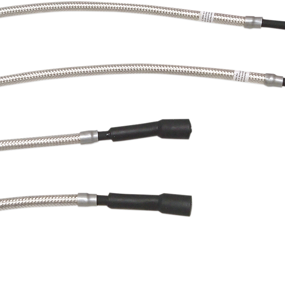 Caracteristicas: Braid perfectly matches all other MAGNUM cables and brake lines High-voltage, high temperature 8mm silicone ignition wire with an OE style, high-performance suppression conductor core for compatibility with all H-D ignition systems Heavy walled extreme duty crystal clear FEP Fluoropolymer outer insulation eliminates the need for grounding wires and insures no interference with late model computer modules. Stainless steel posi-lock terminals and silicone boots ensure maximum performance and clean spark delivery. Direct fitments for ease of installation