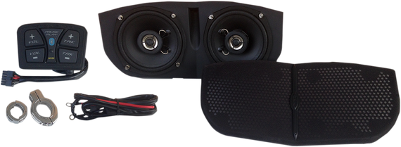 Caracteristicas: Includes custom "pod" with dual 4.25" speaker made to fit Memphis Shades Batwing fairings Includes a handlebar-mounted 50-watt amp with built-in Bluetooth® receiver/controller Amp/controller comes with mounting clamp that fits 7/8", 1" or 1-1/4" handlebars Amp/controller has an additional wired auxiliary input for GPS, satellite radio, etc. Amp/controller features a "hi level" audio output that can be used to add additional amplifiers Measures approximately 11-11/16" W x 5-1/4" T x 5-1/2" D Kit may not fit if gauges are riser-mounted.