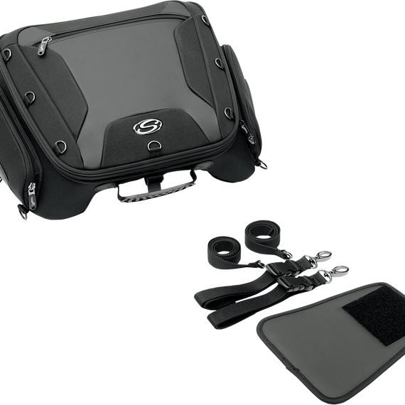Caracteristicas: Fits rear seat/pillions with included mounting system Rugged 1200-denier SaddleTuff™ construction for long life Large main compartment spacious enough for laptop or notebook computer Three internal pockets and three big exterior pockets allow easy access when on the go Two of the exterior pockets expand an additional 2" for extra storage Water-resistant construction with integrated rain cover Thirteen exterior D-rings for attaching other items like jacket or other luggage (six concealed D-rings to prevent scratching) Tech organizer for smartphones, digital cameras, or MP3 players Adjustable main compartment clamshell straps can be opened a full 180° Comfortable carry handle allows the bag to be used as a suitcase when off the bike Semi-rigid construction holds shape and looks great even when empty Included mounting system features additional straps for extra security; once secured to the rear seat/pillion area, the bags can be removed and re-attached within seconds using a series of cam locks on the outside of the bag