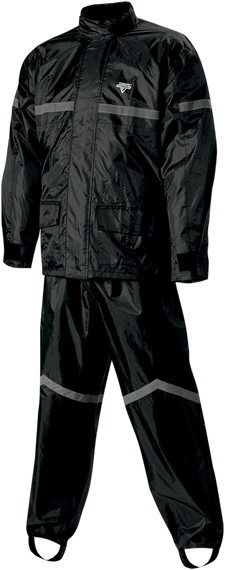 Caracteristicas: 100% waterproof two-piece rain suit Features PVC backing with a soft polyester outer shell, a full-length zipper with hook-and-loop storm flaps and two large outer pockets with gusset expanders Cooling vents under each arm and a soft corduroy inner collar with a hood Pants include adjustable cuffs with hook-and-loop tabs and an elasticized waist for a comfortable fit Oversized zipper gussets and elasticized boot stirrups Both pants and jacket include highly visible reflective striping for nighttime riding
