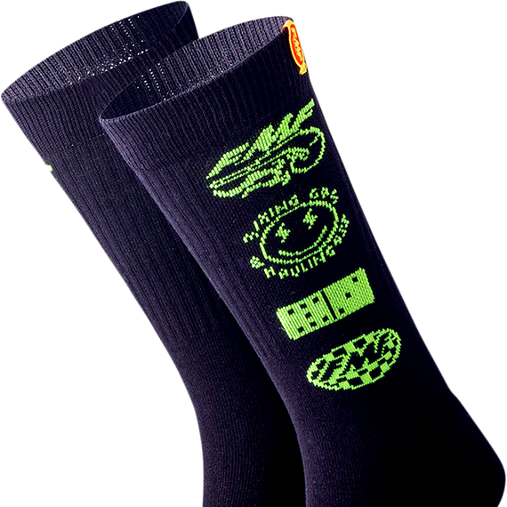 Caracteristicas: Stacked knitted neon FMF logos Shift knitted on bottom of right sock, Brake knitted on left sock FMF woven label on both socks Content: 73% Cotton / 14% Spandex / 13% Polyester