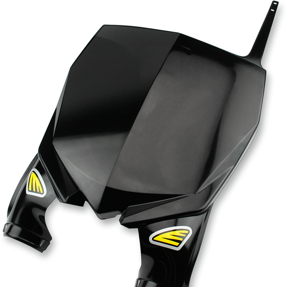 Caracteristicas: Used by factory teams Ultra-lightweight and slim with extra space for stabilizers and bike electronics Includes Works cable guide and a crossbar strap Top mounting; wraps around the fork tubes Older models include upper mounting bracket to fit front mount triple clamps Comes with white and black screens Made in the U.S.A.