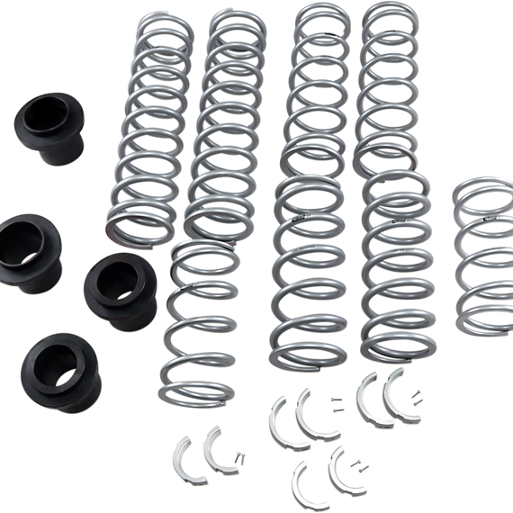 Caracteristicas: All systems include springs, sliders, stop rings and complete setup instructions Race-proven durability and quality Engineered and tested by drivers Designed for 2- and 4-seat vehicles Adjustable shock lockout collars included to allow fine-tuning of the transition point of the dual-spring setup Improves turn-in response and better power hookup out of the turns Smoother ride over rough terrain Stiffer spring rates prevent bottoming in the G-outs Made in the U.S.A.