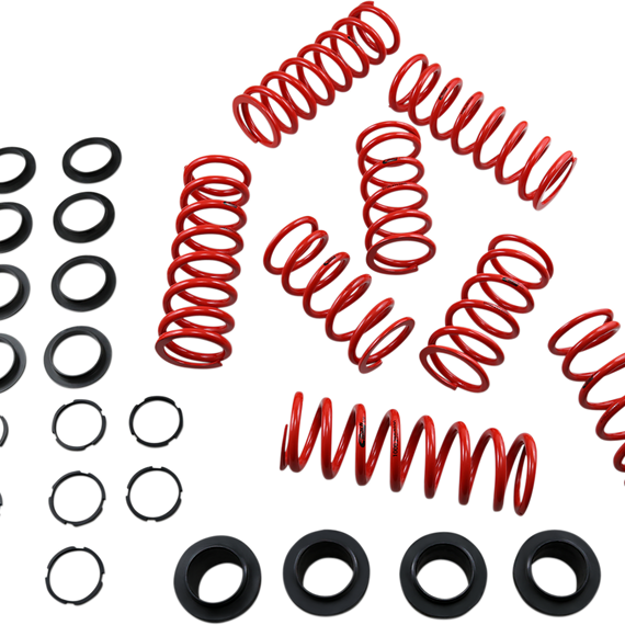 Caracteristicas: All systems include springs, sliders, stop rings and complete setup instructions Race-proven durability and quality Engineered and tested by drivers Designed for 2- and 4-seat vehicles Adjustable shock lockout collars included to allow fine-tuning of the transition point of the dual-spring setup Improves turn-in response and better power hookup out of the turns Smoother ride over rough terrain Stiffer spring rates prevent bottoming in the G-outs Made in the U.S.A.