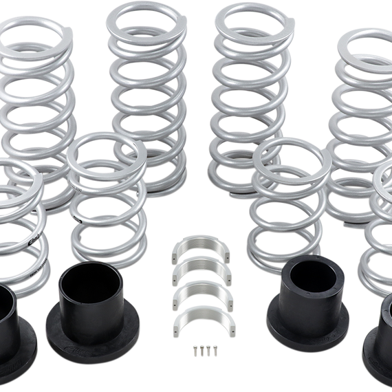 Caracteristicas: All systems include springs, sliders, stop rings and complete setup instructions Race-proven durability and quality Engineered and tested by drivers Designed for 2- and 4-seat vehicles Adjustable shock lockout collars included to allow fine-tuning of the transition point of the dual-spring setup Improves turn-in response and better power hookup out of the turns Smoother ride over rough terrain Stiffer spring rates prevent bottoming in the G-outs Made in the U.S.A.