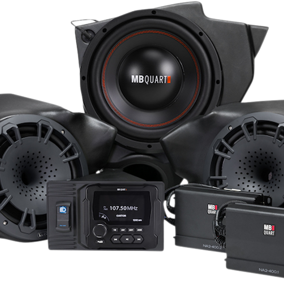 Caracteristicas: AM/FM/Bluetooth®/Aux Input Source Options Front speakers: Compression horns mounted in custom left & right fitted enclosures 10" dual-coil 4-ohm Subwoofer in fitted enclosure High-efficiency full-range Class D 400w two-channel amplifier and 400w subwoofer amplifier Includes fitted interface, amplifier harness and amplifier/speaker mounting brackets