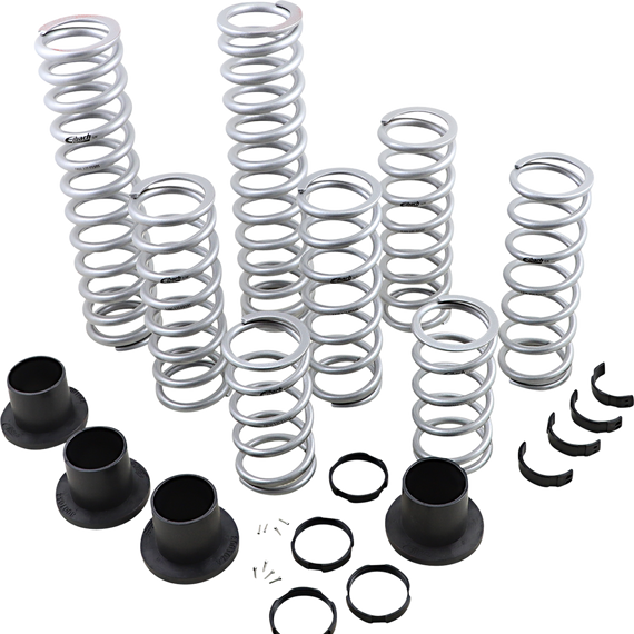 Caracteristicas: All systems include springs, sliders, stop rings and complete setup instructions Race-proven durability and quality Engineered and tested by drivers For 2- and 4-seat vehicles with higher loads and multiple passengers More aggressive spring rates keep the machine balanced Adjustable shock lockout collars included to allow fine-tuning of the transition point of the dual-spring setup Improves turn-in response and better power hookup out of the turns Smoother ride over rough terrain Stiffer spring rates prevent bottoming in the G-outs Made in the U.S.A.