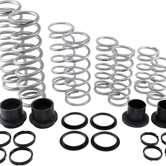 Caracteristicas: All systems include springs, sliders, stop rings and complete setup instructions Race-proven durability and quality Engineered and tested by drivers For 2- and 4-seat vehicles with higher loads and multiple passengers More aggressive spring rates keep the machine balanced Adjustable shock lockout collars included to allow fine-tuning of the transition point of the dual-spring setup Improves turn-in response and better power hookup out of the turns Smoother ride over rough terrain Stiffer spring rates prevent bottoming in the G-outs Made in the U.S.A.