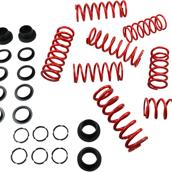 Caracteristicas: All systems include springs, sliders, stop rings and complete setup instructions Race-proven durability and quality Engineered and tested by drivers For 2- and 4-seat vehicles with higher loads and multiple passengers More aggressive spring rates keep the machine balanced Adjustable shock lockout collars included to allow fine-tuning of the transition point of the dual-spring setup Improves turn-in response and better power hookup out of the turns Smoother ride over rough terrain Stiffer spring rates prevent bottoming in the G-outs Made in the U.S.A.