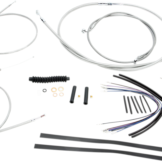Caracteristicas: Magnum XR Handlebar Installation Kits offer a great fit and excellent quality at an economical price Kit features highly polished, chrome plated fittings All cables are a low effort, high efficiency design that meets or exceeds all OE specifications for fitment, construction, endurance Magnum XR Brake Lines use an enhanced construction of heavy gauge stainless steel embedded in tough abrasion resistant nylon outer jacket for superior durability and extreme braking response for safe riding The coating on cables and brake lines offers exceptional protection for paint or chrome Kits that include manifolds use an all brazed construction to ensure optimal OE fitment and appearance Manifolds use -3 AN connections for an easy installation Kits include throttle and idle cables or throttle-by-wire extensions, clutch cable or XR hydraulic clutch line, XR brake lines, copper crush washers, hardware, turn signal and switch wiring extensions Kits are based on using ape hanger style handlebars and 2" risers.