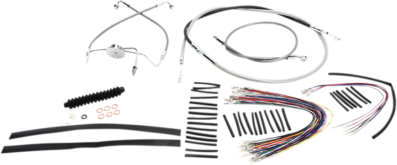 Caracteristicas: Magnum XR Handlebar Installation Kits offer a great fit and excellent quality at an economical price Kit features highly polished, chrome plated fittings All cables are a low effort, high efficiency design that meets or exceeds all OE specifications for fitment, construction, endurance Magnum XR Brake Lines use an enhanced construction of heavy gauge stainless steel embedded in tough abrasion resistant nylon outer jacket for superior durability and extreme braking response for safe riding The coating on cables and brake lines offers exceptional protection for paint or chrome Kits that include manifolds use an all brazed construction to ensure optimal OE fitment and appearance Manifolds use -3 AN connections for an easy installation Kits include throttle and idle cables or throttle-by-wire extensions, clutch cable or XR hydraulic clutch line, XR brake lines, copper crush washers, hardware, turn signal and switch wiring extensions Kits are based on using ape hanger style handlebars and 2" risers.