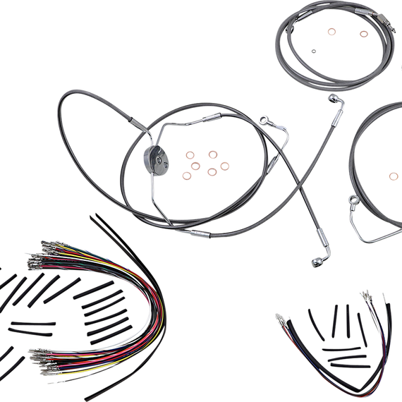 Caracteristicas: Magnum XR Handlebar Installation Kits offer a great fit and excellent quality at an economical price Kit features highly polished, chrome plated fittings All cables are a low effort, high efficiency design that meets or exceeds all OE specifications for fitment, construction, endurance Magnum XR Brake Lines use an enhanced construction of heavy gauge stainless steel embedded in tough abrasion resistant nylon outer jacket for superior durability and extreme braking response for safe riding The coating on cables and brake lines offers exceptional protection for paint or chrome Kits that include manifolds use an all brazed construction to ensure optimal OE fitment and appearance Manifolds use -3 AN connections for an easy installation Kits include throttle and idle cables or throttle-by-wire extensions, clutch cable or XR hydraulic clutch line, XR brake lines, copper crush washers, hardware, turn signal and switch wiring extensions Kits are based on using ape hanger style handlebars and 2" risers.