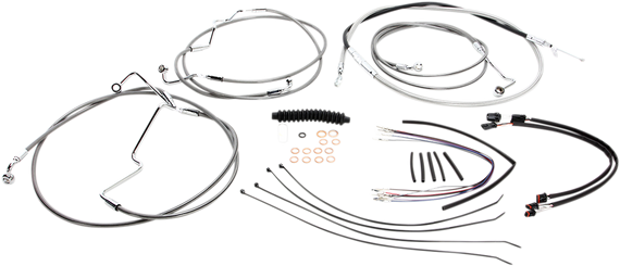 Caracteristicas: Magnum XR Handlebar Installation Kits offer a great fit and excellent quality at an economical price Kit features highly polished, chrome plated fittings All cables are a low effort, high efficiency design that meets or exceeds all OE specifications for fitment, construction, endurance Magnum XR Brake Lines use an enhanced construction of heavy gauge stainless steel embedded in tough abrasion resistant nylon outer jacket for superior durability and extreme braking response for safe riding The coating on cables and brake lines offers exceptional protection for paint or chrome Kits that include manifolds use an all brazed construction to ensure optimal OE fitment and appearance Manifolds use -3 AN connections for an easy installation Kits include throttle and idle cables or throttle-by-wire extensions, clutch cable or XR hydraulic clutch line, XR brake lines, copper crush washers, hardware, turn signal and switch wiring extensions Kits are based on using ape hanger style handlebars and 2" risers.