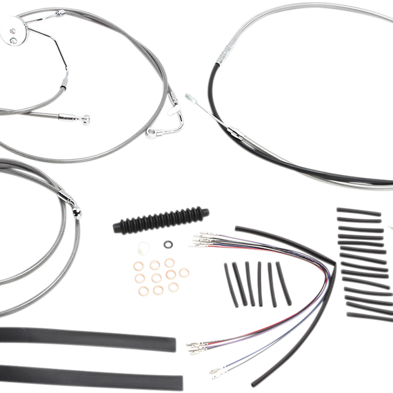 Caracteristicas: Magnum XR Handlebar Installation Kits offer a great fit and excellent quality at an economical price Kit features highly polished, chrome plated fittings All cables are a low effort, high efficiency design that meets or exceeds all OE specifications for fitment, construction, endurance Magnum XR Brake Lines use an enhanced construction of heavy gauge stainless steel embedded in tough abrasion resistant nylon outer jacket for superior durability and extreme braking response for safe riding The coating on cables and brake lines offers exceptional protection for paint or chrome Kits that include manifolds use an all brazed construction to ensure optimal OE fitment and appearance Manifolds use -3 AN connections for an easy installation Kits include throttle and idle cables or throttle-by-wire extensions, clutch cable or XR hydraulic clutch line, XR brake lines, copper crush washers, hardware, turn signal and switch wiring extensions Kits are based on using ape hanger style handlebars and 2" risers.
