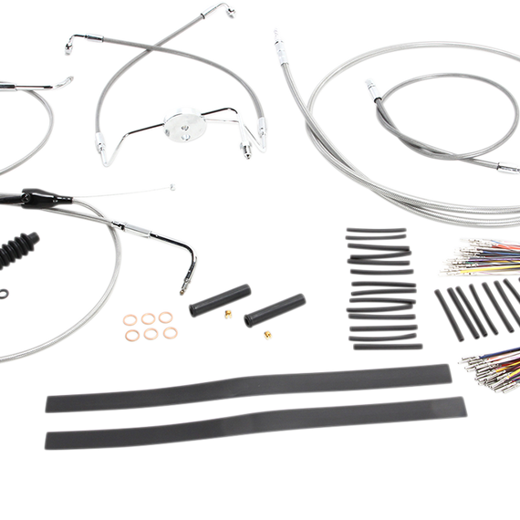 Caracteristicas: Magnum XR Handlebar Installation Kits offer a great fit and excellent quality at an economical price Kit features highly polished, chrome plated fittings All cables are a low effort, high efficiency design that meets or exceeds all OE specifications for fitment, construction, endurance Magnum XR Brake Lines use an enhanced construction of heavy gauge stainless steel embedded in tough abrasion resistant nylon outer jacket for superior durability and extreme braking response for safe riding The coating on cables and brake lines offers exceptional protection for paint or chrome Kits that include manifolds use an all brazed construction to ensure optimal OE fitment and appearance Manifolds use -3 AN connections for an easy installation Kits include throttle and idle cables or throttle-by-wire extensions, clutch cable or XR hydraulic clutch line, XR brake lines, copper crush washers, hardware, turn signal and switch wiring extensions Kits are based on using ape hanger style handlebars and 2" risers.
