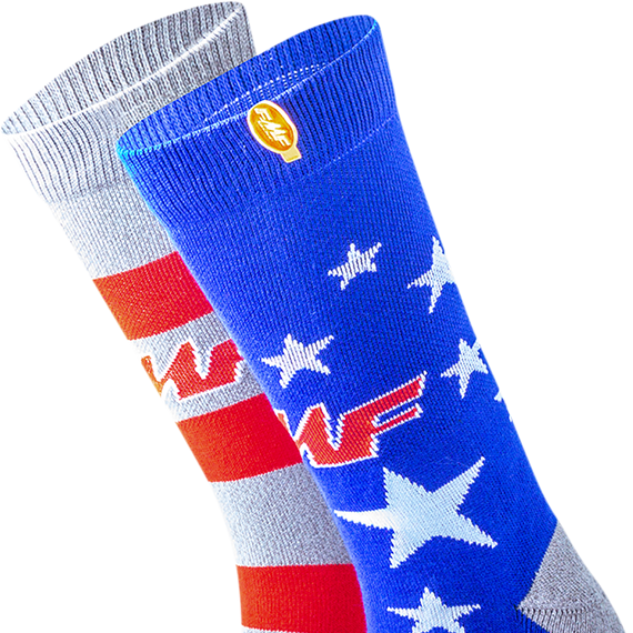 Caracteristicas: Mixed Stars and Stripes Knit Shift knitted on bottom of right sock, Brake knitted on bottom of left sock FMF woven label on both socks Content: 73% Cotton / 13% Polyester / 14% Spandex