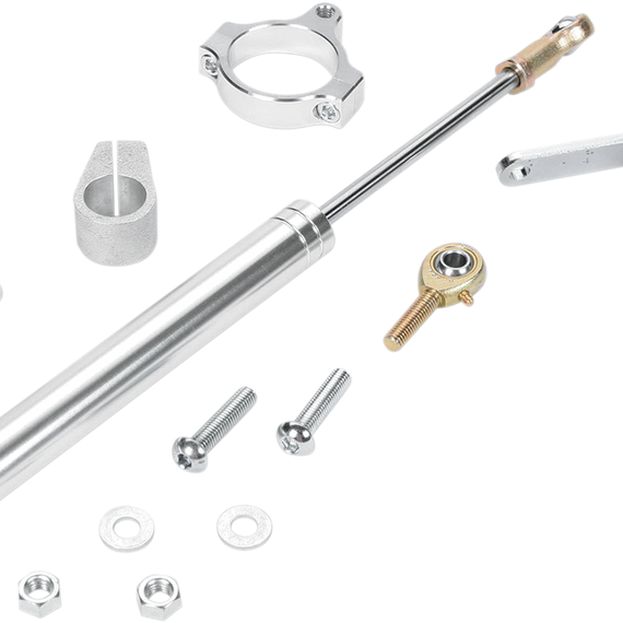 Caracteristicas: Specially designed for each application Kits include an individual length of stabilizer and complete bolt-on brackets without rivet mounting for easy and secure installation Dampen unwanted fork oscillations (speed wobble) Seven-position hydraulic steering dampers Fully adjustable; allows full-fork movement from stop-to-stop Includes required mounting hardware and instructions for installation