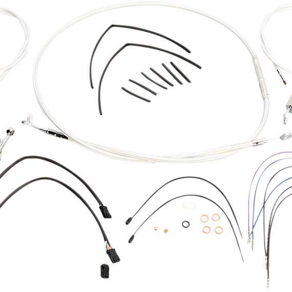 Caracteristicas: Complete kits with matching braided cables and brake lines Kits include throttle and idle cables of throttle-by-wire extensions, clutch cable or hydraulic clutch line, brake lines, copper crush washers, hardware, and any necessary switch wiring of turn signal extension All cable and brake lines feature Sterling Chromite II braid with highly polished chrome plated fittings All cables are a low-effort, high-efficiency design that meets or exceeds all OE specifications for fitment, construction and endurance Kits for dual disc models include an all brazed manifold that eliminates leaks, alignment problems and unattractive threaded connections Assembled in the U.S.A. Kits are based on using ape hanger style handlebars with 2” risers