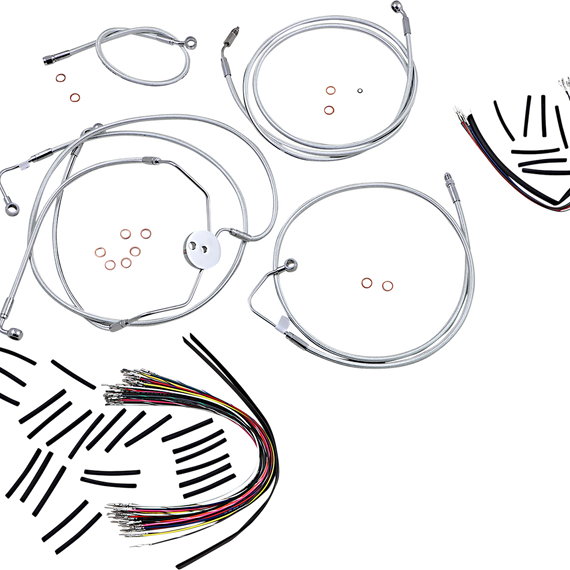Caracteristicas: Complete kits with matching braided cables and brake lines Kits include throttle and idle cables of throttle-by-wire extensions, clutch cable or hydraulic clutch line, brake lines, copper crush washers, hardware, and any necessary switch wiring of turn signal extension All cable and brake lines feature Sterling Chromite II braid with highly polished chrome plated fittings All cables are a low-effort, high-efficiency design that meets or exceeds all OE specifications for fitment, construction and endurance Kits for dual disc models include an all brazed manifold that eliminates leaks, alignment problems and unattractive threaded connections Assembled in the U.S.A. Kits are based on using ape hanger style handlebars with 2” risers