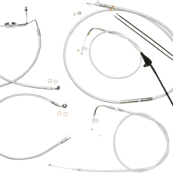 Caracteristicas: Complete kits with matching braided cables and brake lines Kits include throttle and idle cables of throttle-by-wire extensions, clutch cable or hydraulic clutch line, brake lines, copper crush washers, hardware, and any necessary switch wiring of turn signal extension All cable and brake lines feature Sterling Chromite II braid with highly polished chrome plated fittings All cables are a low-effort, high-efficiency design that meets or exceeds all OE specifications for fitment, construction and endurance Kits for dual disc models include an all brazed manifold that eliminates leaks, alignment problems and unattractive threaded connections Assembled in the U.S.A. Kits are based on using ape hanger style handlebars with 2” risers