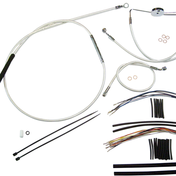 • Kits include throttle and idle cables of throttle-by-wire extensions, clutch cable or hydraulic clutch line, brake lines, copper crush washers, hardware, and any necessary switch wiring of turn signal extension