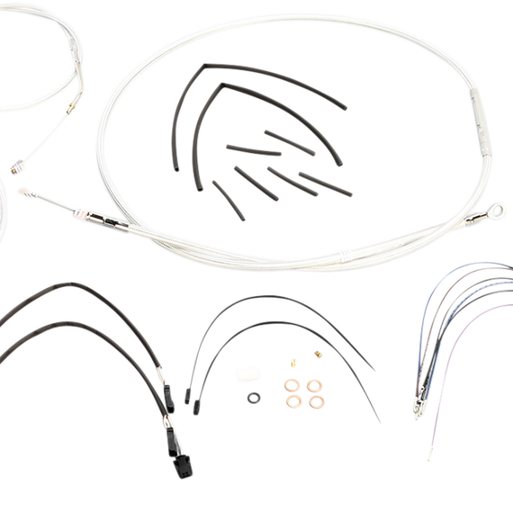 Caracteristicas: Complete kits with matching braided cables and brake lines Kits include throttle and idle cables of throttle-by-wire extensions, clutch cable or hydraulic clutch line, brake lines, copper crush washers, hardware, and any necessary switch wiring of turn signal extension All cable and brake lines feature Sterling Chromite II braid with highly polished chrome plated fittings All cables are a low-effort, high-efficiency design that meets or exceeds all OE specifications for fitment, construction and endurance Kits for dual disc models include an all brazed manifold that eliminates leaks, alignment problems and unattractive threaded connections Assembled in the U.S.A. Kits are based on using ape hanger style handlebars with 2” risers