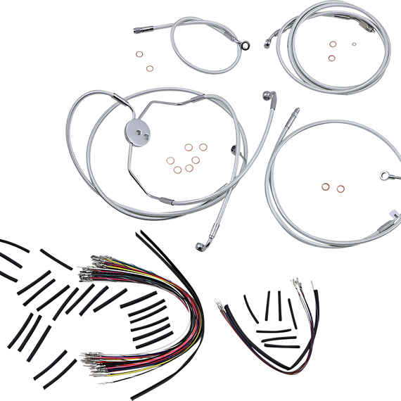 Caracteristicas: Complete kits with matching braided cables and brake lines Kits include throttle and idle cables of throttle-by-wire extensions, clutch cable or hydraulic clutch line, brake lines, copper crush washers, hardware, and any necessary switch wiring of turn signal extension All cable and brake lines feature Sterling Chromite II braid with highly polished chrome plated fittings All cables are a low-effort, high-efficiency design that meets or exceeds all OE specifications for fitment, construction and endurance Kits for dual disc models include an all brazed manifold that eliminates leaks, alignment problems and unattractive threaded connections Assembled in the U.S.A. Kits are based on using ape hanger style handlebars with 2” risers