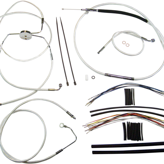 Caracteristicas: Complete kits with matching braided cables and brake lines Kits include throttle and idle cables of throttle-by-wire extensions, clutch cable or hydraulic clutch line, brake lines, copper crush washers, hardware, and any necessary switch wiring of turn signal extension All cable and brake lines feature Sterling Chromite II braid with highly polished chrome plated fittings All cables are a low-effort, high-efficiency design that meets or exceeds all OE specifications for fitment, construction and endurance Kits for dual disc models include an all brazed manifold that eliminates leaks, alignment problems and unattractive threaded connections Assembled in the U.S.A. Kits are based on using ape hanger style handlebars with 2” risers
