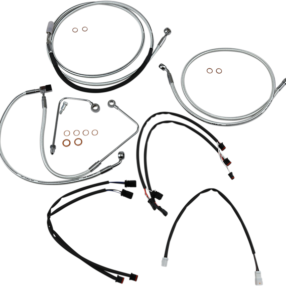 • Kits include throttle and idle cables of throttle-by-wire extensions, clutch cable or hydraulic clutch line, brake lines, copper crush washers, hardware, and any necessary switch wiring of turn signal extension