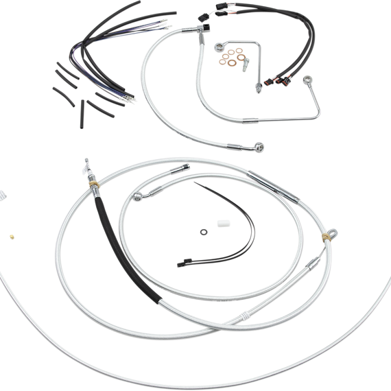 • Kits include throttle and idle cables of throttle-by-wire extensions, clutch cable or hydraulic clutch line, brake lines, copper crush washers, hardware, and any necessary switch wiring of turn signal extension