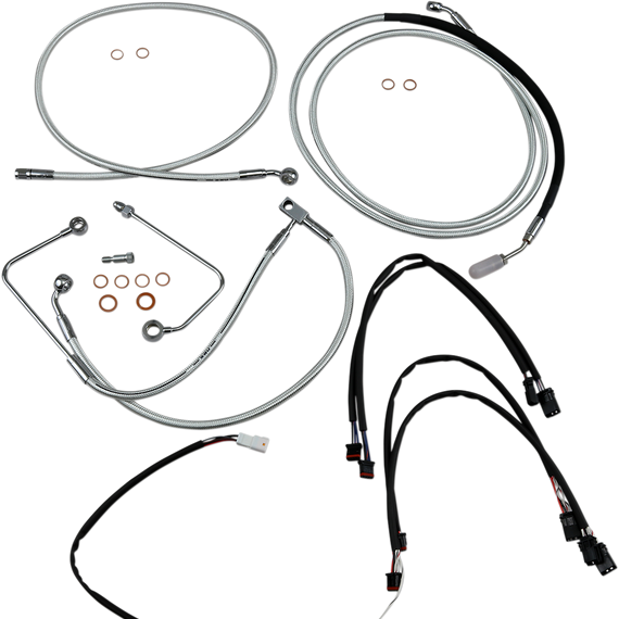 • Kits include throttle and idle cables of throttle-by-wire extensions, clutch cable or hydraulic clutch line, brake lines, copper crush washers, hardware, and any necessary switch wiring of turn signal extension