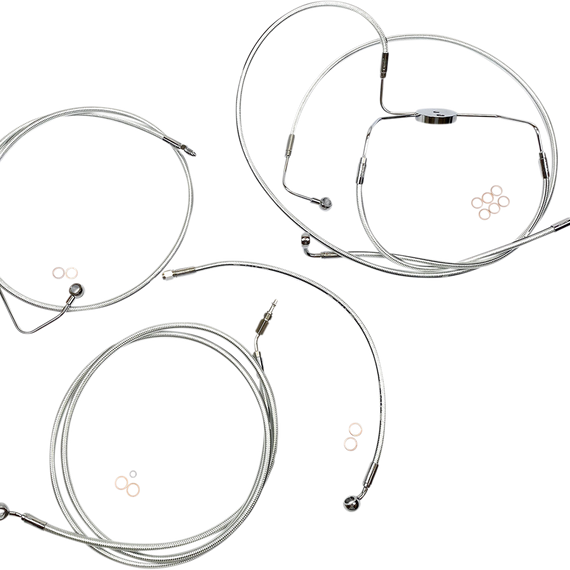 Caracteristicas: Complete kits with matching braided cables and brake lines Kits include throttle and idle cables of throttle-by-wire extensions, clutch cable or hydraulic clutch line, brake lines, copper crush washers, hardware, and any necessary switch wiring of turn signal extension All cable and brake lines feature Sterling Chromite II braid with highly polished chrome plated fittings All cables are a low-effort, high-efficiency design that meets or exceeds all OE specifications for fitment, construction and endurance Kits for dual disc models include an all brazed manifold that eliminates leaks, alignment problems and unattractive threaded connections Assembled in the U.S.A. Kits are based on using ape hanger style handlebars with 2†risers