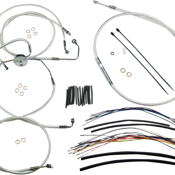 Caracteristicas: Complete kits with matching braided cables and brake lines Kits include throttle and idle cables of throttle-by-wire extensions, clutch cable or hydraulic clutch line, brake lines, copper crush washers, hardware, and any necessary switch wiring of turn signal extension All cable and brake lines feature Sterling Chromite II braid with highly polished chrome plated fittings All cables are a low-effort, high-efficiency design that meets or exceeds all OE specifications for fitment, construction and endurance Kits for dual disc models include an all brazed manifold that eliminates leaks, alignment problems and unattractive threaded connections Assembled in the U.S.A. Kits are based on using ape hanger style handlebars with 2†risers