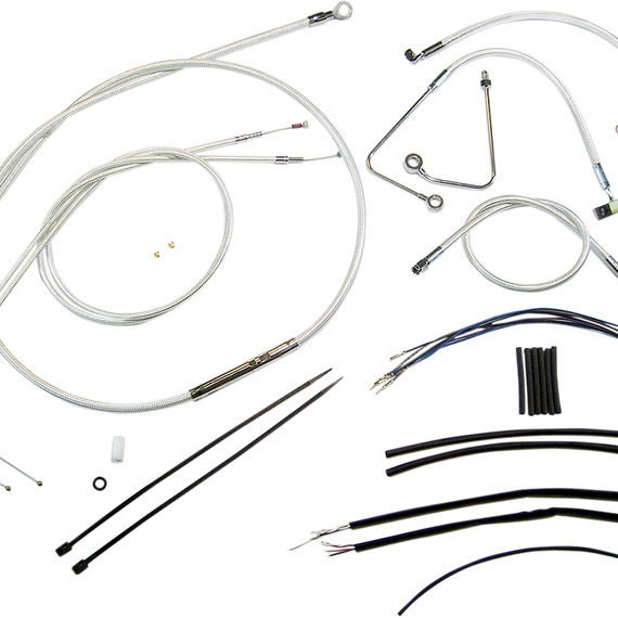 Caracteristicas: Complete kits with matching braided cables and brake lines Kits include throttle and idle cables of throttle-by-wire extensions, clutch cable or hydraulic clutch line, brake lines, copper crush washers, hardware, and any necessary switch wiring of turn signal extension All cable and brake lines feature Sterling Chromite II braid with highly polished chrome plated fittings All cables are a low-effort, high-efficiency design that meets or exceeds all OE specifications for fitment, construction and endurance Kits for dual disc models include an all brazed manifold that eliminates leaks, alignment problems and unattractive threaded connections Assembled in the U.S.A. Kits are based on using ape hanger style handlebars with 2†risers