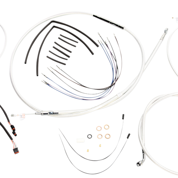 Caracteristicas: Complete kits with matching braided cables and brake lines Kits include throttle and idle cables of throttle-by-wire extensions, clutch cable or hydraulic clutch line, brake lines, copper crush washers, hardware, and any necessary switch wiring of turn signal extension All cable and brake lines feature Sterling Chromite II braid with highly polished chrome plated fittings All cables are a low-effort, high-efficiency design that meets or exceeds all OE specifications for fitment, construction and endurance Kits for dual disc models include an all brazed manifold that eliminates leaks, alignment problems and unattractive threaded connections Assembled in the U.S.A. Kits are based on using ape hanger style handlebars with 2†risers
