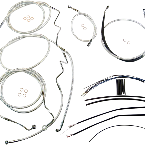 Caracteristicas: Complete kits with matching braided cables and brake lines Kits include throttle and idle cables of throttle-by-wire extensions, clutch cable or hydraulic clutch line, brake lines, copper crush washers, hardware, and any necessary switch wiring of turn signal extension All cable and brake lines feature Sterling Chromite II braid with highly polished chrome plated fittings All cables are a low-effort, high-efficiency design that meets or exceeds all OE specifications for fitment, construction and endurance Kits for dual disc models include an all brazed manifold that eliminates leaks, alignment problems and unattractive threaded connections Assembled in the U.S.A. Kits are based on using ape hanger style handlebars with 2†risers
