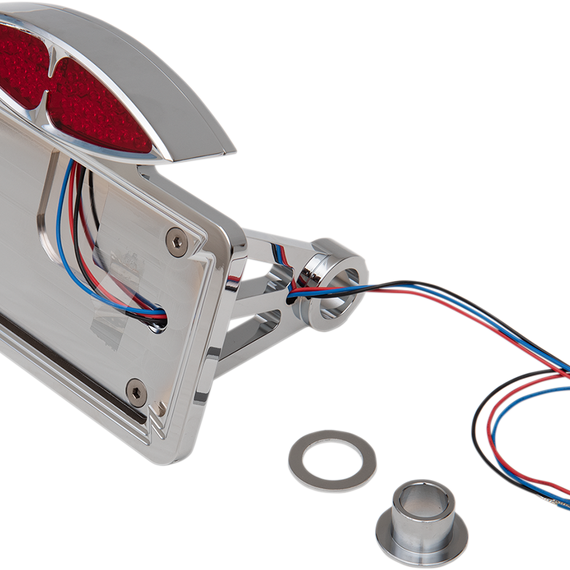 Caracteristicas: Combination taillight and license plate mount Cool Art-Deco style Cat Eye taillight adds a retro style to your custom Dual-function LED taillight will make sure you're visible Brake light pulses when first applied, then lights steady Aluminum billet construction, polished and chrome plated Acorn nut dresses up the axle, works with most sidemount license mounts on 3/4" Softail style axles Not DOT compliant.