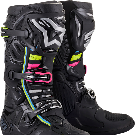 Caracteristicas: The most significant upgrades to the Tech 10 performance are unique technologies: The Frontal Flexion Control Frame, the Asymmetrical Dual-pivot Arms, the patented Dynamic Heel Compression Protection Shock Absorber which is integrated into a redesigned foot shell and the slimmer, more streamlined, outsole. New material composites have been created that are lighter in weight and more durable to ensure they hold up to the rigors of off-road riding. The new, cold-forged, aluminum buckles are a result with an easier to operate, more durable and self-aligning closure that offer a positive hold across the upper surfaces of the boot. The result has yielded over 400 grams (almost 1lb) in weight reduction for the new Tech 10. The design also reduces the Tech 10’s profile and physical size. It is more streamlined with newer, lighter, more durable composite materials and a more integrated approach to the construction of the components which dynamically enhance the chassis of the boot and utilize more advanced bonding processes. Asymmetrical medial and lateral double pivot system for improved levels of flexibility and precision for both independent and synchronized movement Constructed from a dual density compound and combined with the rear blade system Double pivot system allows the Tech 10 to retain its integrity while flexing Energy dissipating shin plate features a new anatomic design for reduced surface area and weight-saving Exclusive dual-compound sole is seamlessly integrated to the multi-density foot base structure with built-in support Foot shell features five different compounds in a single lightweight piece to offer strength while maintaining flexibility and structural integrity Innovative flexion inserts work seamlessly with new flex support system for ultimate in performance Low-profile, pull-on design for reduce material build, less weight and to facilitate easier and quicker wearing Poly-fabric lining with 3D open cell foam incorporates anti-slip suede in heel area, keeping the foot located inside the boot Provides a complete and seamless flexion control system, from the foot shell all the way up to the shin plate Redesigned dual density Thermoplastic Polyurethane (TPU) rear blade system engineered to prevent hyper-extension while offering improved flex control and impact resistance TPU protection and shock absorbing padding on the heel and ankles Ankle control system developed in the outer shell construction, allowing natural ankle movement, vertical compression control and improved impact protection Asymmetrical, dual pivot arms on boot frame Chassis combines advanced lightweight microfiber and impact and abrasion resistant TPU shell Closure system features contra-closure, doubling closure security and a quick release/locking system with self-aligning, memory, design for easy, precise closure and improved riding performance and security Combines dual front and rear blade connectors Completely redesigned sole with proprietary grip sculpturing to improve foot-peg performance, grip and mud and water run-off Contoured TPU calf protector plate offers impact resistance Dynamic Heel Compression Protector (DHCP), an innovative safety feature which includes a fully integrated collapsible heel area with expanded poly-foam to absorb high impact energies during a crash Engineered to 'float' freely between the lower and upper boot construction Patented technology features lighter, anatomically redesigned medial and lateral torsion arms Slim-line buckles include high-impact bridge closures which are cold forged for precision and strength Soft microfiber gaiter helps seal out excessive water and dirt entry Soles and buckles are easily replaceable