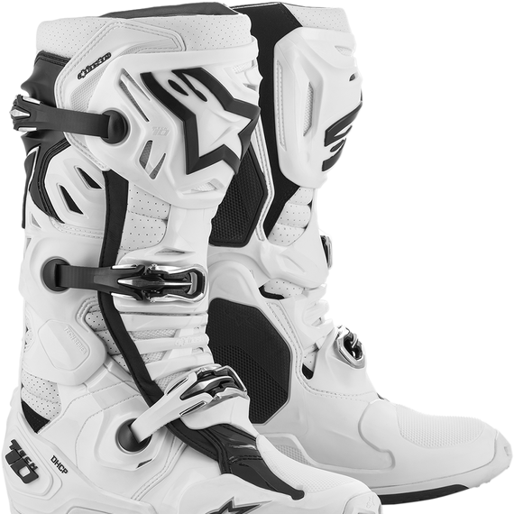 Caracteristicas: Construction uses a highly breathable, perforated microfiber with internal perforated padding. Highly ventilated perforated padding for optimized ventilation and airflow. TPU features is combined with ventilation zones and a new air flow system sole for breathability and superior ventilation. Two large inlet ports on front of boot with exhausts at back for optimized levels of airflow and heat exchange. 3D Higher Spring insole creates an effective cooling system using air channels within the sole for optimal levels of ventilation, while also creating a cushioning effect for enhanced levels of comfort. Evolutionary new shin plate design with ventilation windows strategically positioned to allow more ventilation and a light weight without compromising the impact protection. Air vents on the PU lateral calf plus breathable mesh insert improve comfort and reduce fatigue on short and long rides. New performance double pivot motion control system features: a medial and lateral double pivot system for improved levels of flexibility and precision control, engineered bi-density front flexion control is strategically positioned over the mesh area, combined with a dual front blade system and shock absorber insert to offer mechanical progressive force release to dampen and absorb impact energies and a re-designed dual density TPU rear blade system is engineered to prevent hyper-extension while offering improved flex control and impact resistance. Co-injected for strength and structure, the exclusive TPU compound panels provide superb levels of grip contact and durability. Completely re-designed sole with proprietary grip sculpturing to improve foot-peg performance, grip and mud and water run-off. Exclusive dual compound sole is seamlessly integrated to the multi-density foot base structure with built-in support. The sole offers superior durability, grip and feel while riding, and improved performance on the shifter. The central sole insert features a micro grip and side hooking grip design. It is easily replaceable and Alpinestars offers a full sole replacement and boot repair service. Perforated footbed for additional cooling. Inner boot has a mesh construction for optimal levels of airflow and light weight, with a technical perforated bottom for additional cooling. Anatomically optimized for weight-saving and ergonomics, the new mechanical buckle closure system features a nylon and fiberglass compound for improved durability and strength. The new slim-line buckle closure system includes high-impact bridge closures which are cold forged for precision and strength. The buckle closure system features a memory and a quick release/locking system with self-aligning design for easy, precise closure and improved riding performance and security. All buckles are easily replaceable. Innovative, lightweight upper combines advanced lightweight microfiber with an impact and abrasion resistant TPU shell. The shin incorporates a unique TPU blade system engineered to prevent frontal hyper-extension and offer greater flex control. Soft microfiber gaiter helps seal out excessive water and dirt entry, while the 3D mesh lining ensures improved air circulation and comfort. 3D mesh lining incorporates anti-sliding suede on heel area to keep the foot located inside the boot. Frontal protection features a dual closure system with an internal microfiber flap, plus hook and loop fasteners for a precise fit closure attached securely with a micro-adjustable, easy to operate, lightweight buckle. The foot shell features five different compounds in a single lightweight piece to offer strength while maintaining flexibility and structural integrity. The foot shell incorporates heel and toe protection and is highly resistant against abrasion and impact while adding to the boot’s overall durability. The foot shell also includes an integrated shank for support and structural integrity. Built into the Tech 10’s unique and lightweight single-piece co-injected foot chassis is the patented Dynamic Heel Compression Protector (DHCP), an innovative safety feature which includes a fully integrated collapsible heel area with expanded polyfoam to absorb high impact energies during a crash. DCHP features a directional impact protection system which significantly reduces the effect of excessive, potentially injury-causing energy being transferred to the ankle and lower leg. DHCP has been developed and tested in the demanding circuits of professional Supercross and Motocross. The contoured calf protector ergonomically wraps around the rear leg and is constructed from a dual density compound rear blade system to offer progressive dampening of excessive torsional forces.
