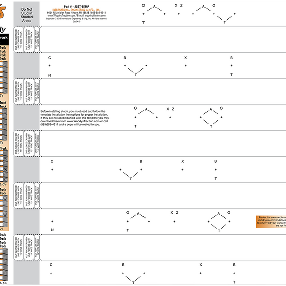 Caracteristicas: Stud patterns on Woody's® templates are CAD-designed to maintain track balance Follow the instructions and you will have the highest level of precision stud placement Printed on laminated heavy card stock