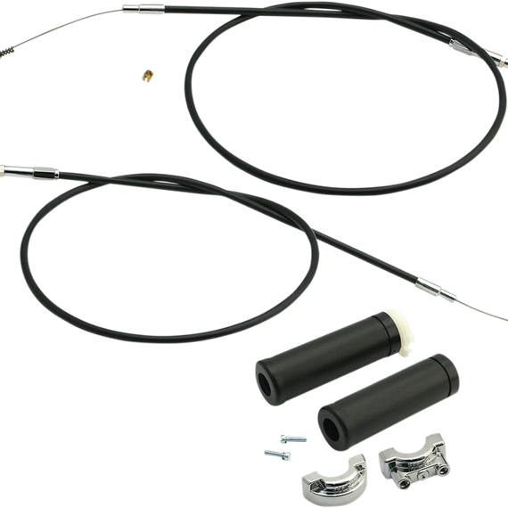 Caracteristicas: Each kit includes a two-cable throttle assembly with matching grips, throttle sleeve, OEM-style throttle and idle cables and hardware Designed for early-style S&S Super E & G carbs or any other butterfly-type carburetor with 81-95 OEM-style throttle linkage Measured from throttle grip to end of cable housing; barrel fittings are soldered in place (not for CV carbs) 90° elbows Made in the U.S.A.