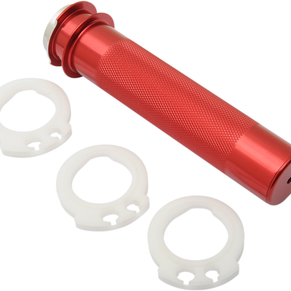 Caracteristicas: Give the rider better control, no matter what the ground condition Throttle cam system alters the ratio between hand-throttle rotation and opening of the carburetor, which improves the rider's control over the bike where it matters most, in the turns System includes a 6061 billet aluminum throttle tube with a knurled surface and three cams Delrin bushings in both ends of the tube eliminate all aluminum-to-aluminum contact to give the feeling of a ball-bearing tube without rust or freeze-up Each included cam is designed with track conditions in mind; one for perfect, one for intermediate and one for slippery or highly technical conditions One cam is stock diameter, the other two have different ramped shapes, which means the rider will turn their hand slightly farther to open the carburetor while in the zero to half-throttle range; the ramped shape ensures full throttle within a quarter turn Changing cams is easily achieved in less than a minute Throttle tube has removable end cap to allow installation of handguard