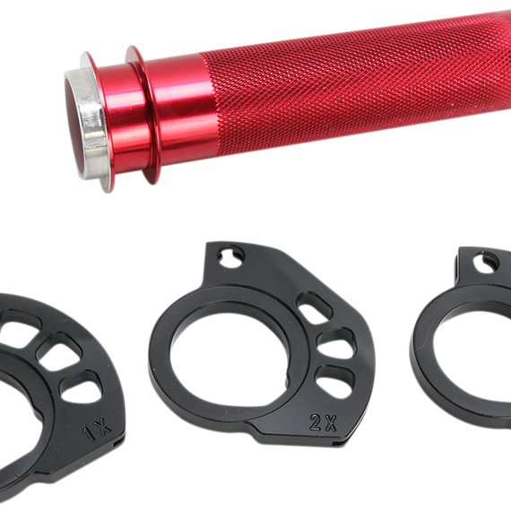 Caracteristicas: Give the rider better control, no matter what the ground condition Throttle cam system alters the ratio between hand-throttle rotation and opening of the carburetor, which improves the rider's control over the bike where it matters most, in the turns System includes a 6061 billet aluminum throttle tube with a knurled surface and three cams Delrin bushings in both ends of the tube eliminate all aluminum-to-aluminum contact to give the feeling of a ball-bearing tube without rust or freeze-up Each included cam is designed with track conditions in mind; one for perfect, one for intermediate and one for slippery or highly technical conditions One cam is stock diameter, the other two have different ramped shapes, which means the rider will turn their hand slightly farther to open the carburetor while in the zero to half-throttle range; the ramped shape ensures full throttle within a quarter turn Changing cams is easily achieved in less than a minute Throttle tube has removable end cap to allow installation of handguard